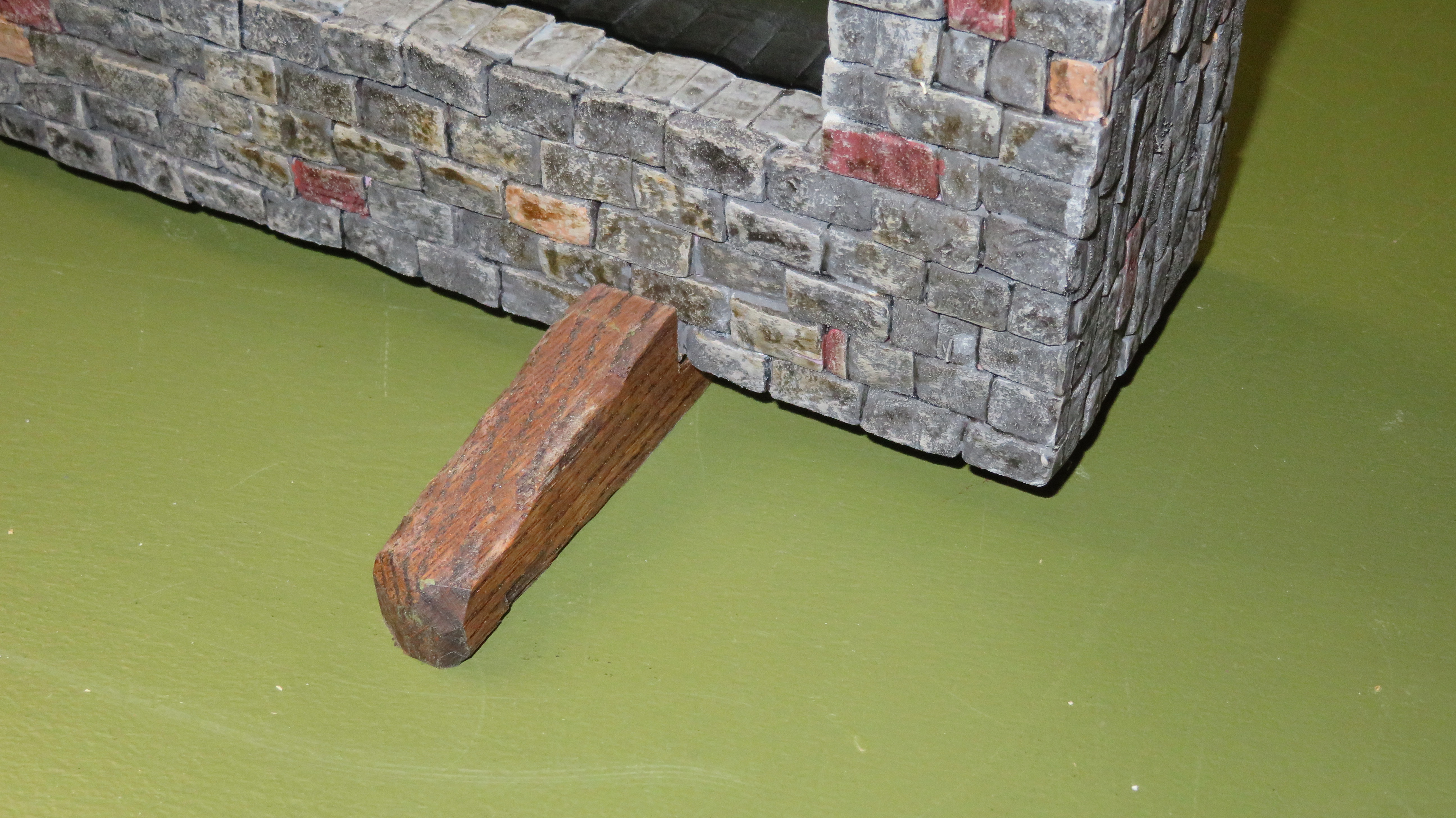 First I cut strips of pink Styrofoam and cut these strips into individual bricks. The actual brick size was 18mm x 9mm x 5mm. After cutting these bricks I put them in to a large coffee container with some rocks and shook them until they were textured.